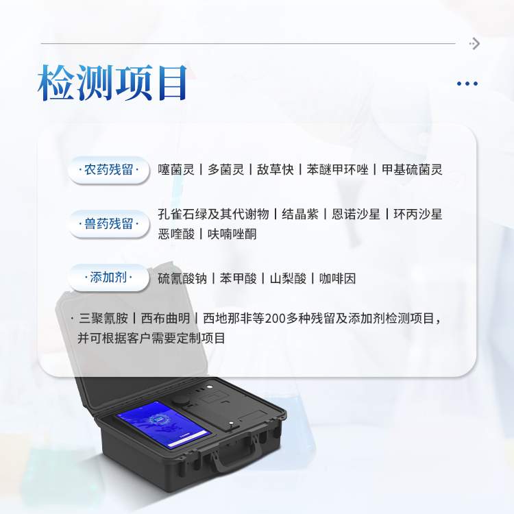 农药残留(噻菌灵、多菌灵、敌草快、苯醚甲环唑、甲基硫菌灵等)、兽药残留(孔雀石绿及其代谢物,结晶紫,恩诺沙星,环丙沙星,恶喹酸,呋喃唑酮等)、添加剂(硫氰酸钠,苯甲酸,山梨酸,咖啡因等),三聚氰胺,西布曲明,西地那非等200多种残留及添加剂检测项目,并可根据客户需要定制项目。